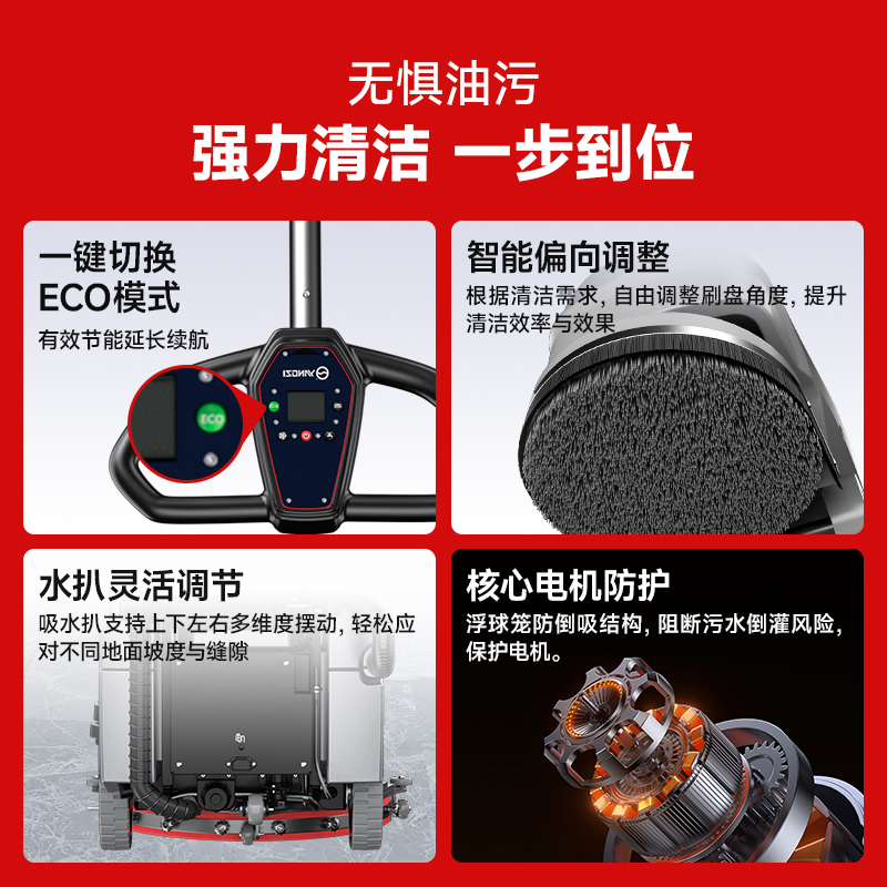 機身寬度僅450mm,可在商超餐廳等場景內(nèi)使用,貼墻清潔輕松使用清潔無死角;176半包圍靈動吸水扒秒干不留痕,轉(zhuǎn)彎不漏水;多維立體出水方式,分布均勻,洗地省水省清潔劑
